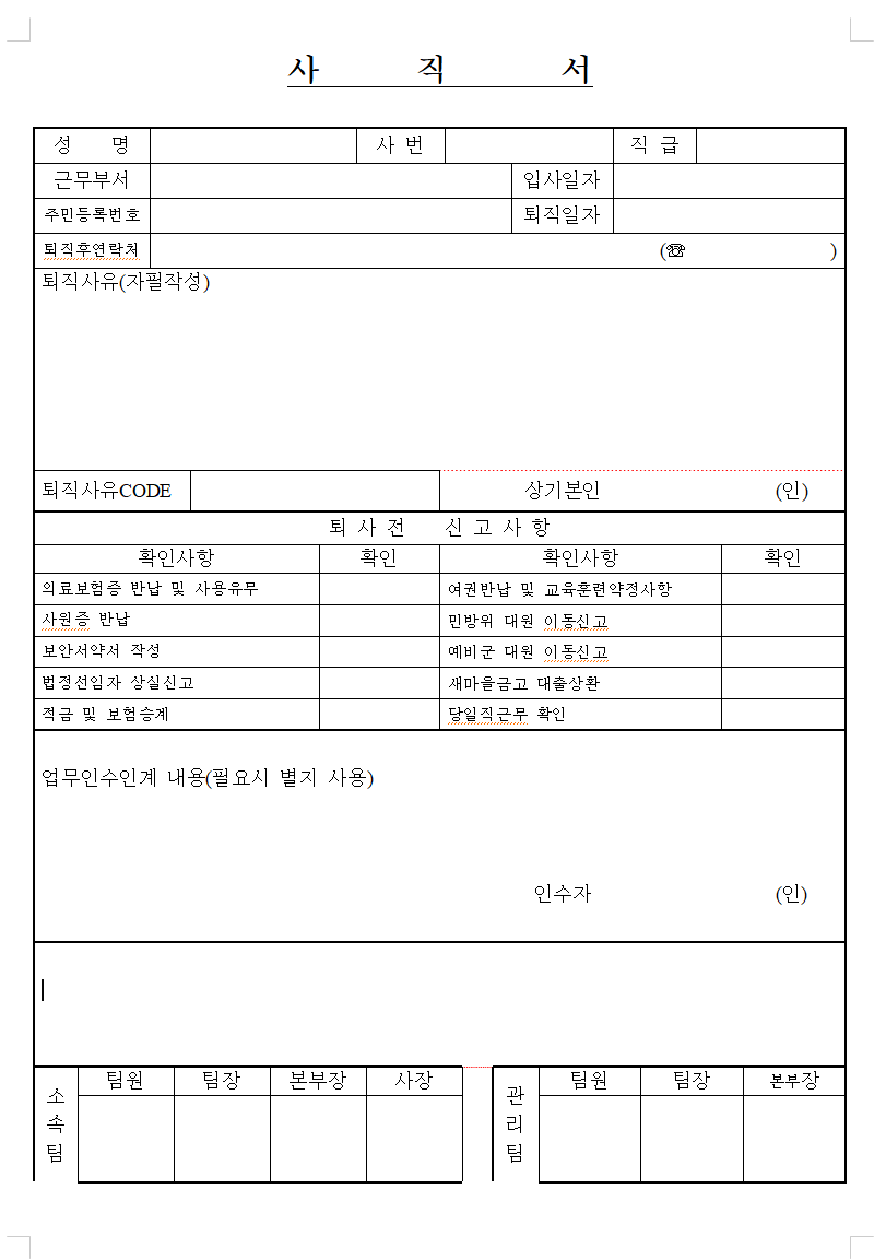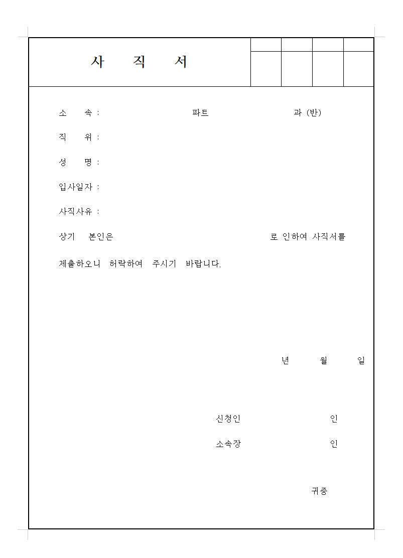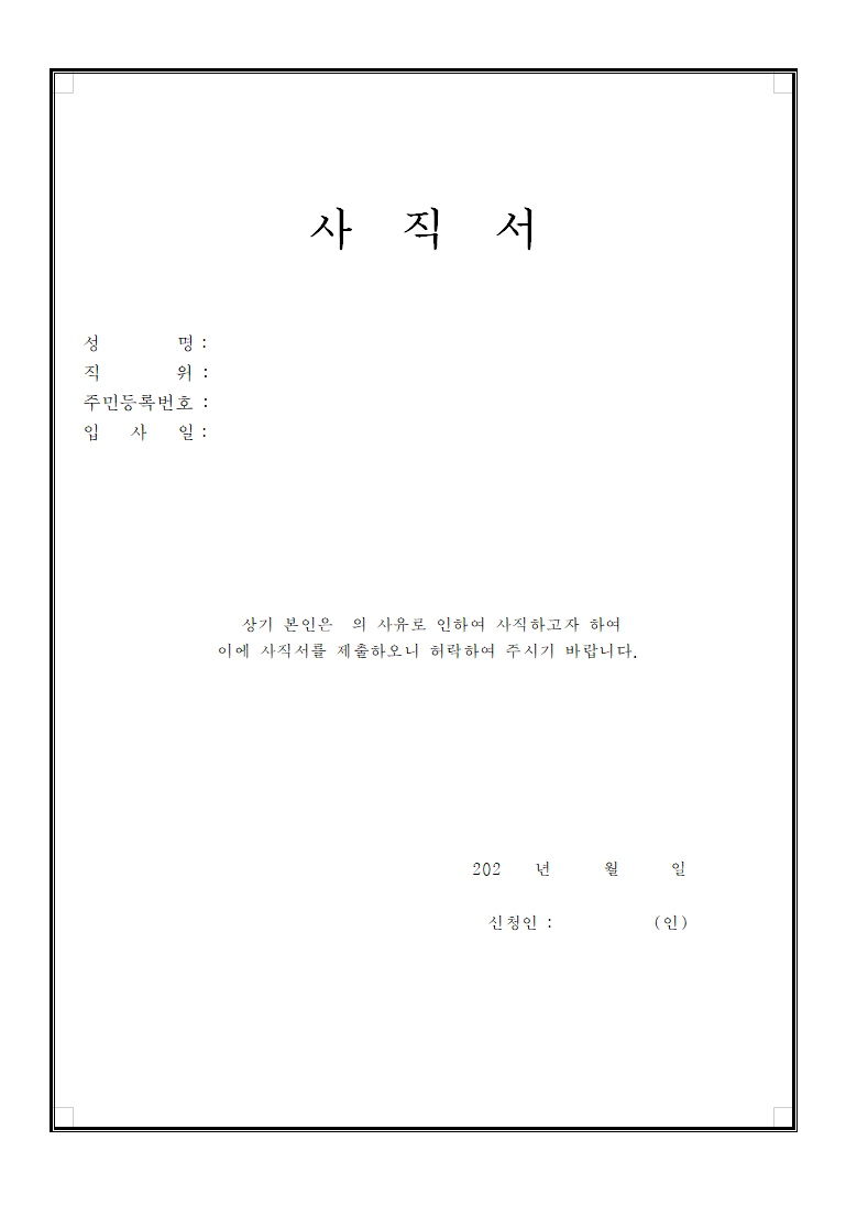 이 포스팅에서는 많이 사용하는 기본 형식의 사직서 양식을