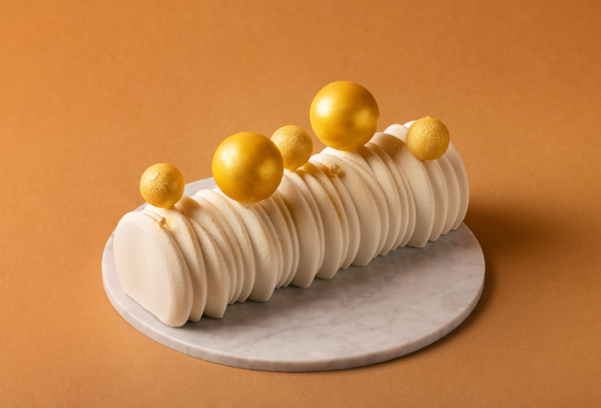 부쉬 드 노엘을 모던하게 해석한 비젼으로 헤이즐넛과 바닐라 디플로마 크림, 캐러멜, 다크초콜릿 크런치로 구성된 케이크입니다.